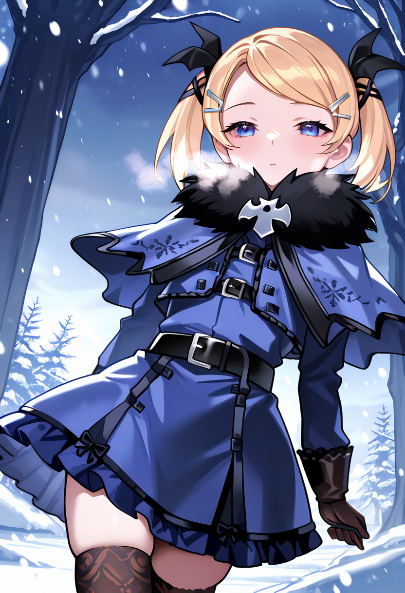 c_casper,blonde hair,blue eyes,twintails,hair ribbon,hairclip,black fur collar,black gloves,blue capelet,blue dress,blue skirt,black belt,black thighhighs,black footwear,knee boots