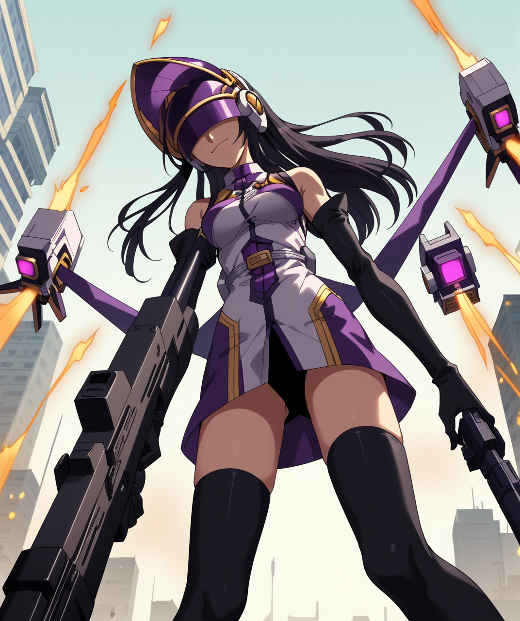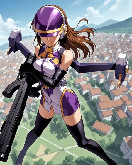 palewing_armor, 1girl, solo, 골드 트림 보라색 및 흰색 헬터 드레스, 검정색 팔꿈치 장갑, 검정색 허벅지 긴 양말, palewing_헬멧, 베이저 내려짐, 눈 가려짐, 녹색 눈, 갈색 긴 머리, palewing_제트팩, 어깨 노출