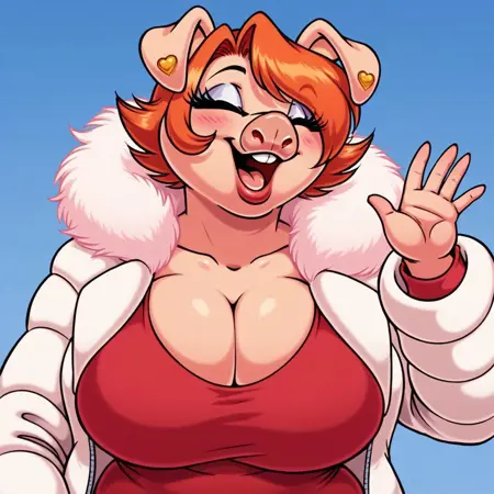 正面提示词:SwellenEP,毛茸茸的,拟人化,猪,猪女孩,橙色头发,短发,黄眼睛,睫毛,黑色眉毛,粉红色身体,猪尾巴,成熟女性,大胸部,丰满的女性