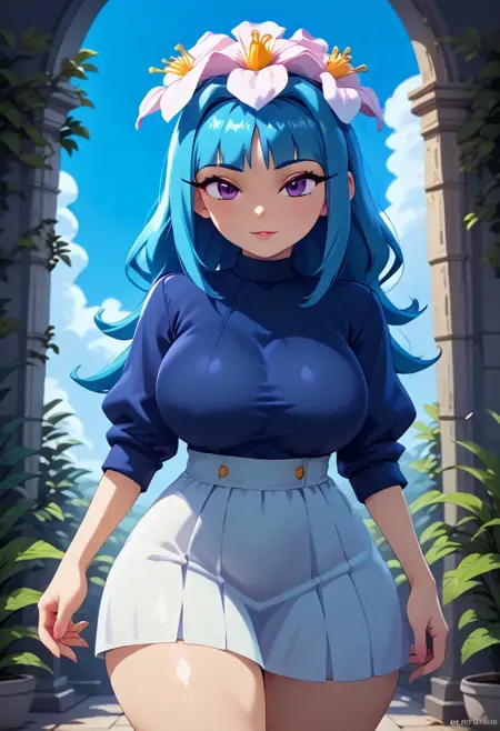 Galaxina the Seedrian, plant girl, cyan hair, purple eyes, flower on head, fauna, dark blue shirt, long white skirt