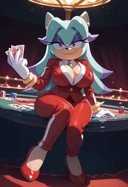 Breezie the Hedgehog, teal skin, lavender eyes, purple eyeshadow, red suit, white gloves, red heels