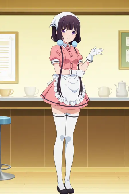 sakuranomiya maika, long hair, black hair, low twintails, blunt bangs, pom pom hair ornament, purple eyes, waitress, headscarf, puffy short sleeves, pink shirt, pink skirt, white gloves, white apron, waist apron, frilled apron, white back bow, white thighhighs, black footwear, flats