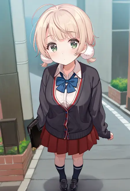 ui-2ndcostume,shigure ui \(vtuber\),green eyes, blonde hair, short hair,ahoge,low twintails,pom pom hair ornament,black cardigan,blue bowtie, red skirt,black socks,black loafers
