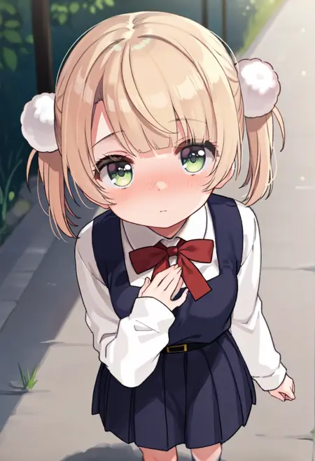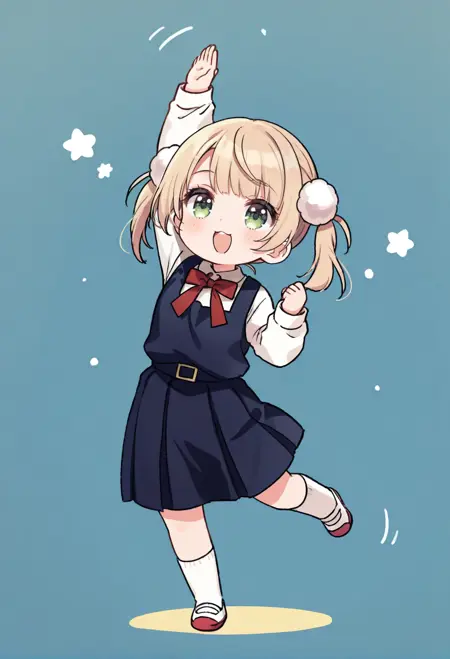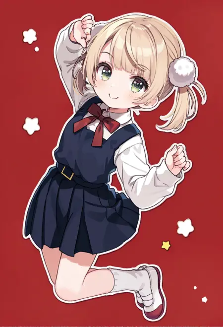 ui-2ndcostume,shigure ui \(vtuber\),green eyes, blonde hair, short hair,ahoge,low twintails,pom pom hair ornament,black cardigan,blue bowtie, red skirt,black socks,black loafers