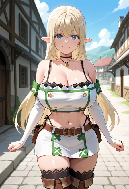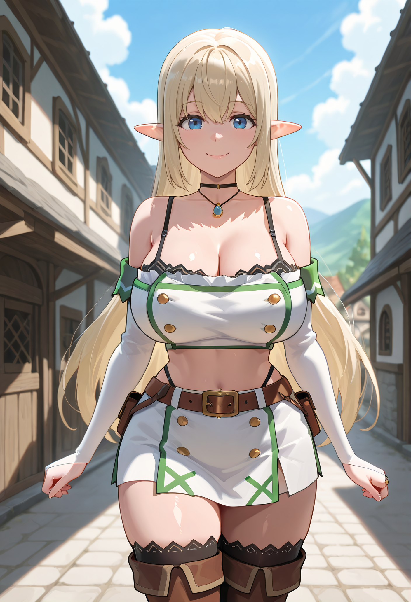 ariasrank, 1girl, long hair, pointy ears, elf, blue eyes, blue eyes, large breasts, cleavage, midriff, hair between eyes, brown footwear, very long hair, thigh boots, highleg panties, jewelry, off shoulder,pendant, skirt, white skirt, ,black thighhighs, thighhighs under boots, thighhighs pattern, (white bridal gauntlets), (black bra strap), off shoulder shirt, choker. black bra, belt, bra pattern