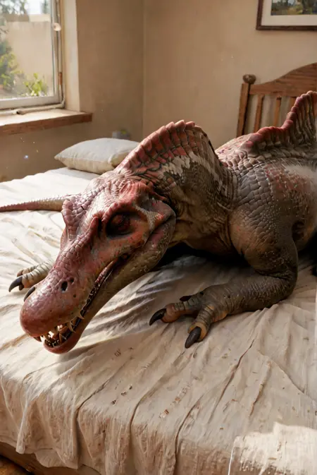 "좋아, 심지어 나도 이 다음 공룡이 놀랍다고 인정해야겠어. 스피노사우루스는 아마도 가장 큰 육식공룡일 거야. 물론, 나는 직접 그걸 가까이서 볼 만큼 가까이 갈 수 없겠지. 하지만 그게 바로 내가 너를 가진 이유야."
