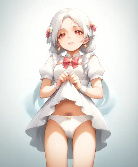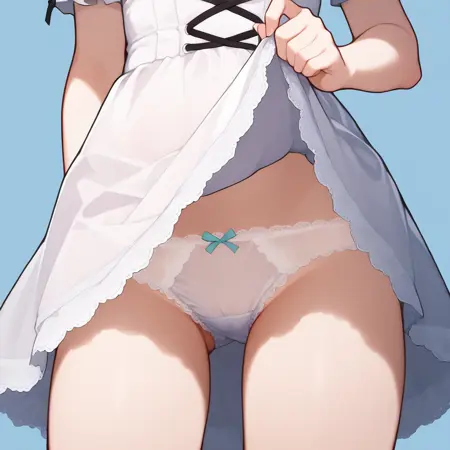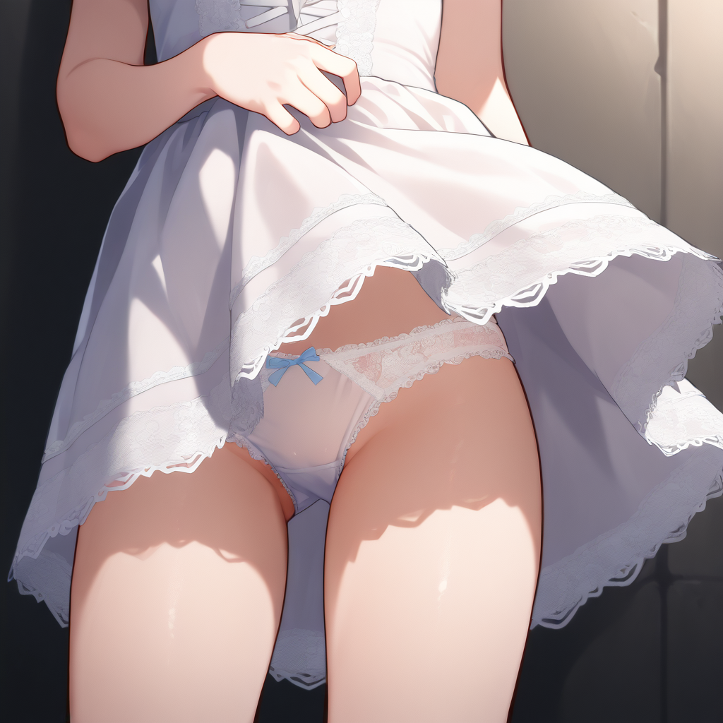 我尝试制作了一个LoRA模型,用于生成前面带有两条对角荷叶边的内裤。我仍然是个新手,所以可能没有做得完美。但另一方面,这个LoRA有时会在内裤前缘上方添加一点点阴毛——如果你喜欢这种风格,不妨试试看!