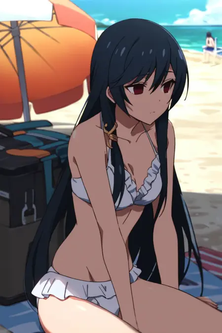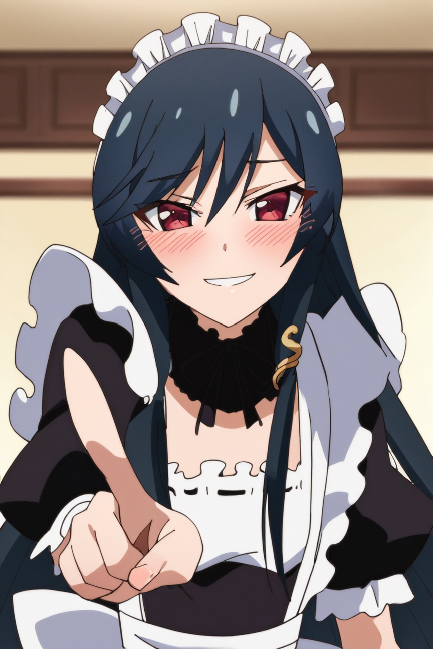 鹿岛由衣 - yui,红眼,黑发,长发,中等乳房,绿色西装外套,蓝色领带,百褶裙,黑色过膝袜