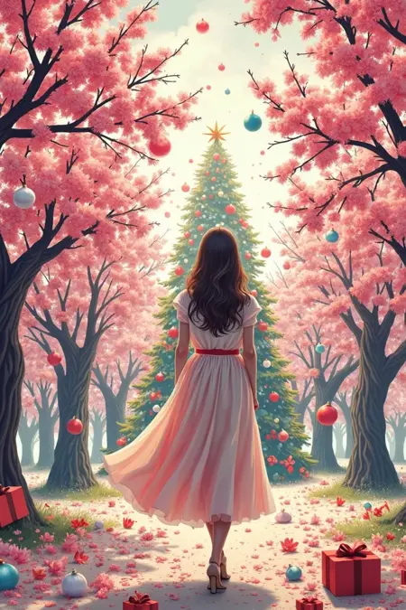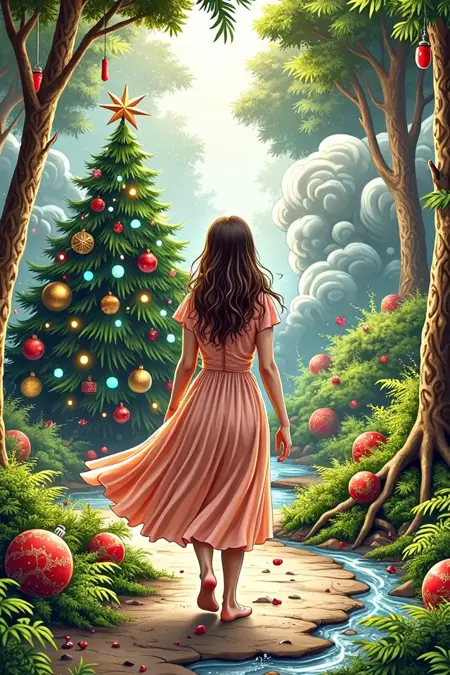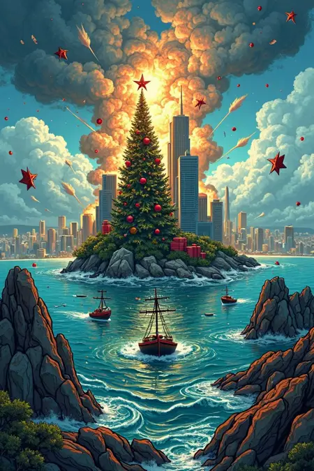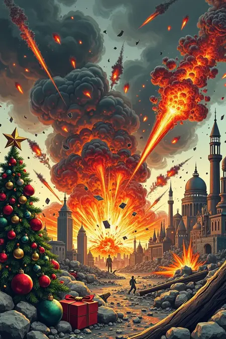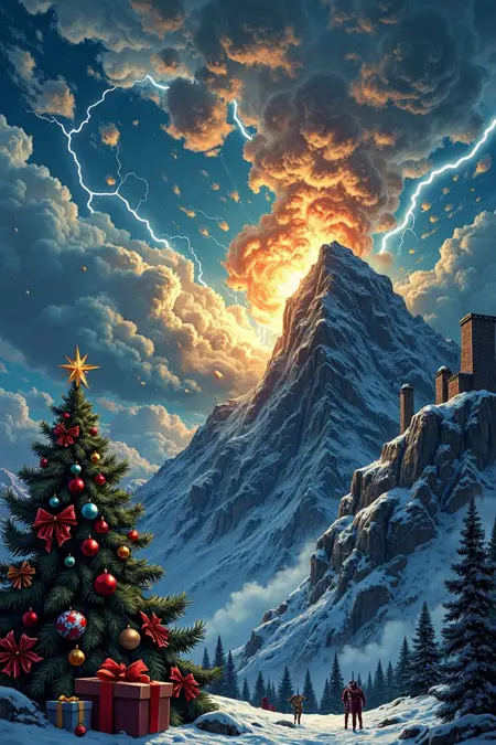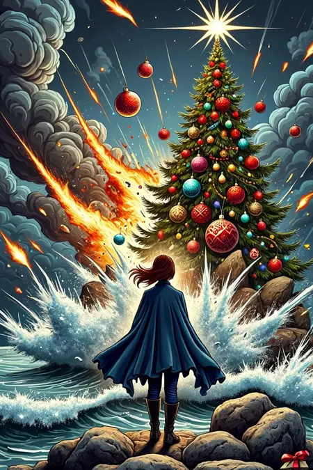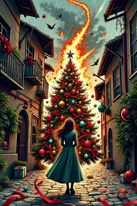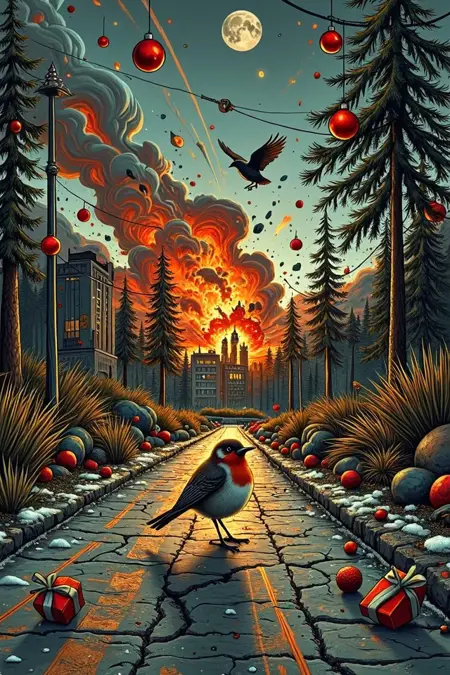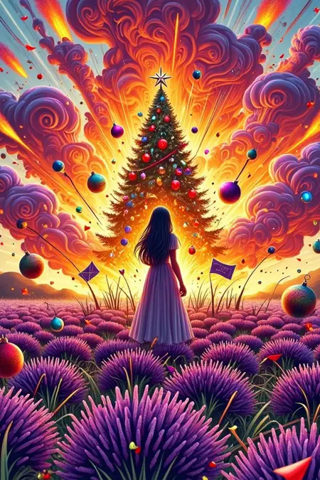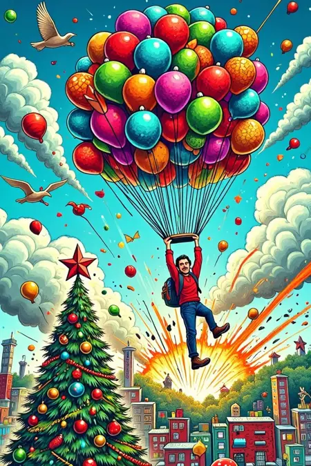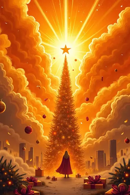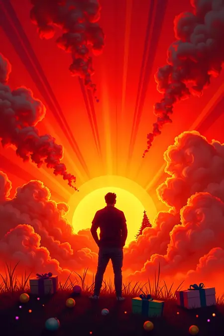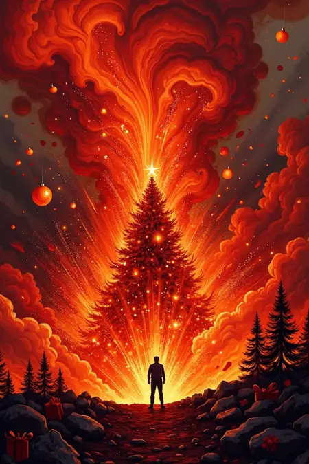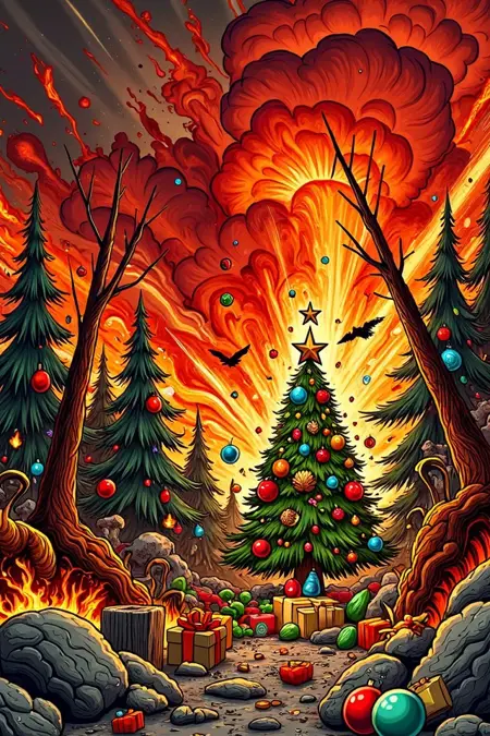 worxma style, smoke, ornaments, christmas tree, presents, explosion, illustration,