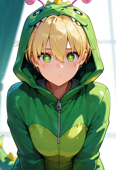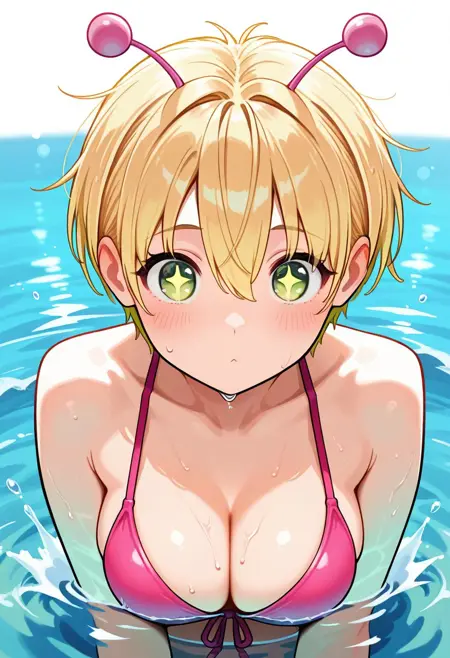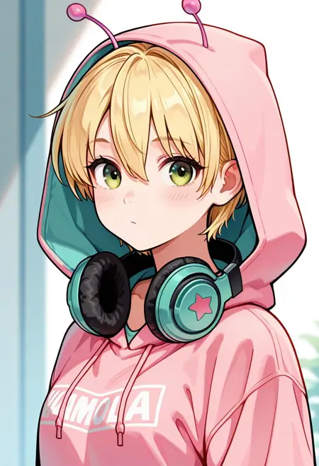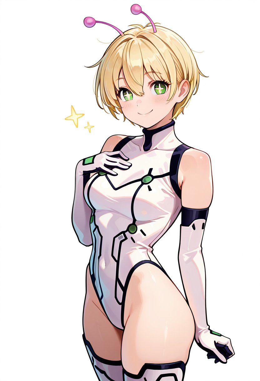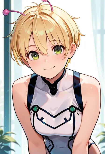 트리거 + 외모: vamola, 1girl, solo, blonde hair, antennae, green eyes, short hair