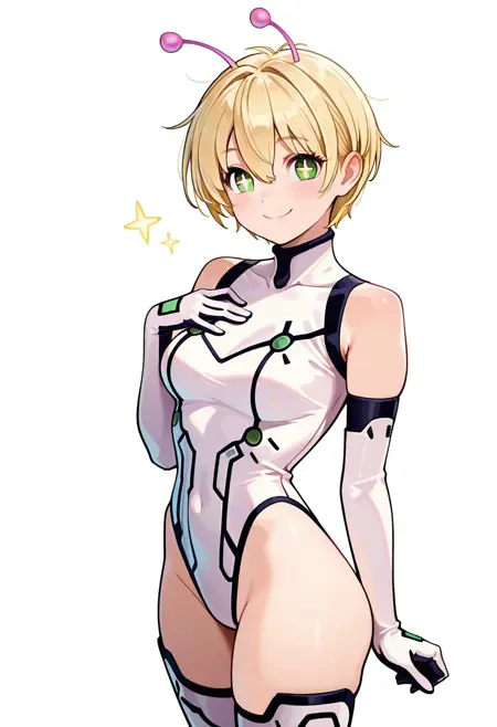 トリガー+外見: vamola, 1girl, solo, blonde hair, antennae, green eyes, short hair