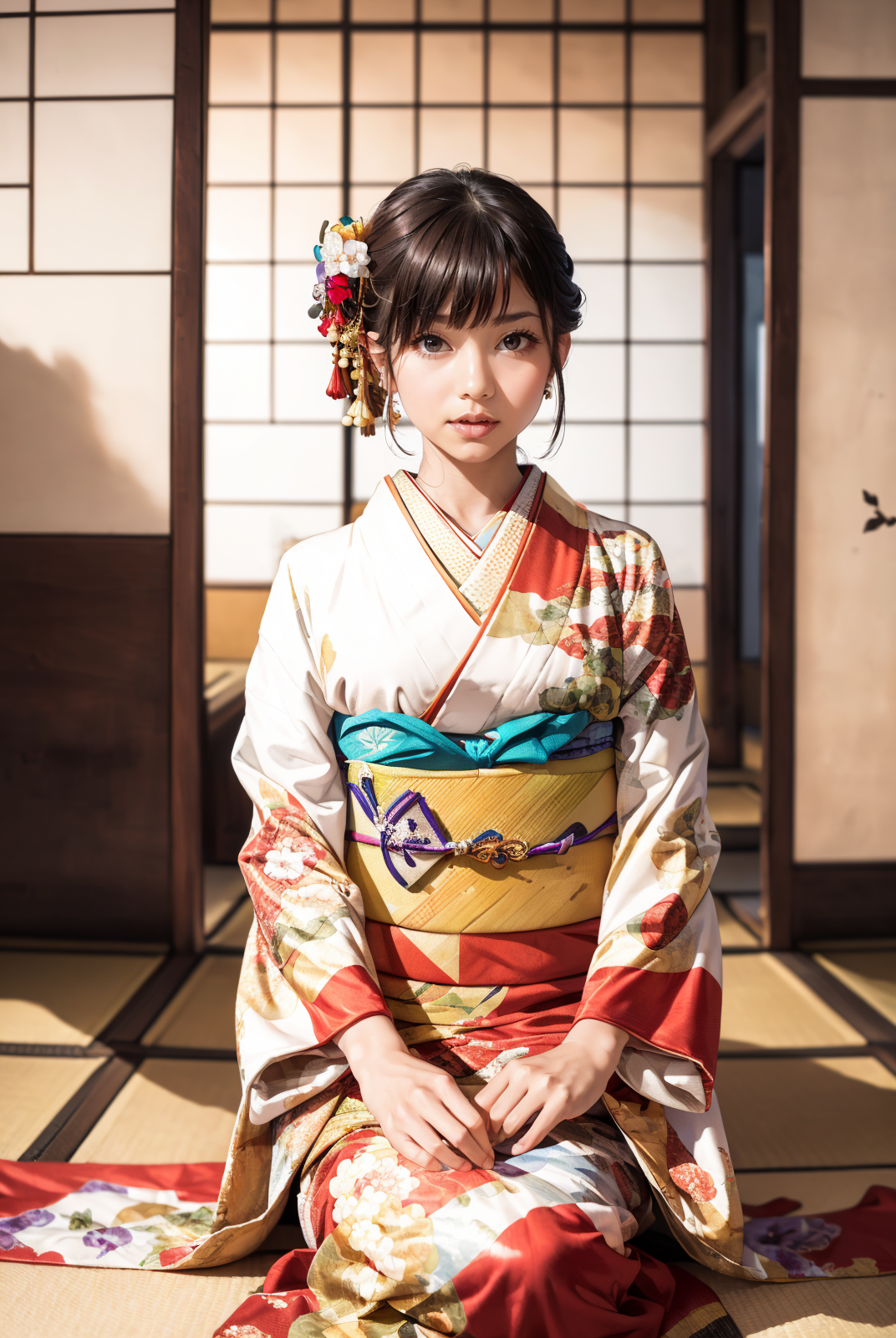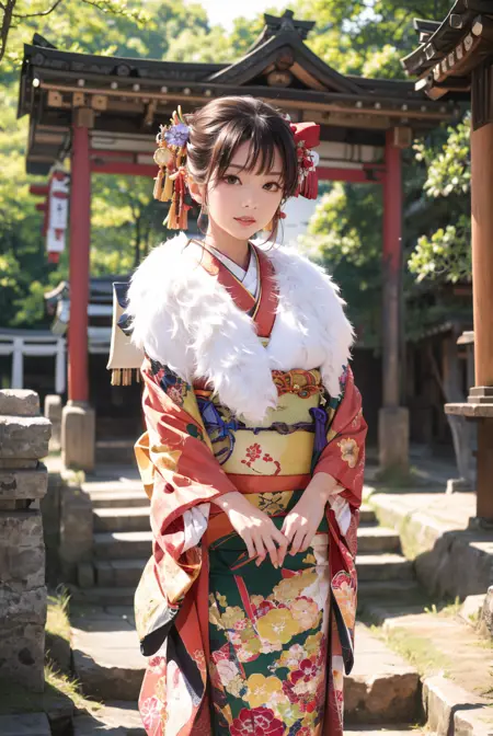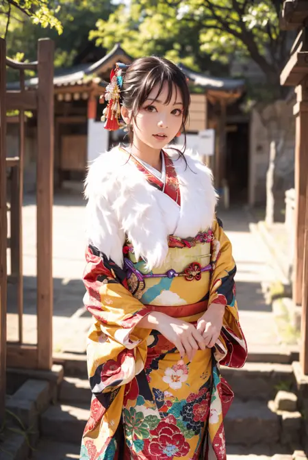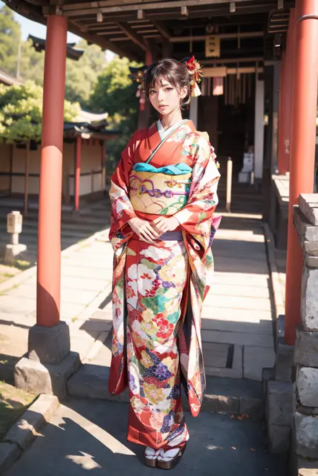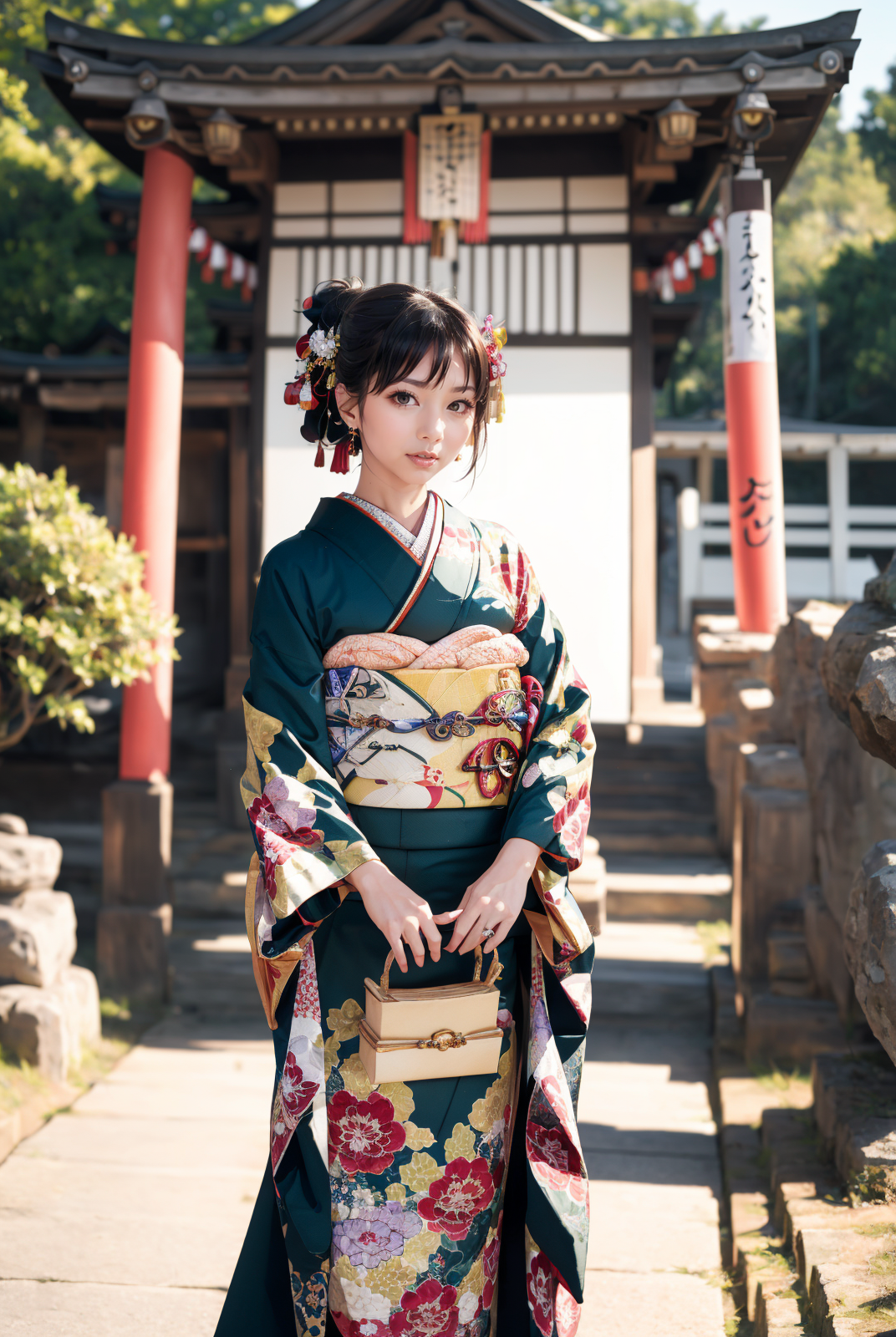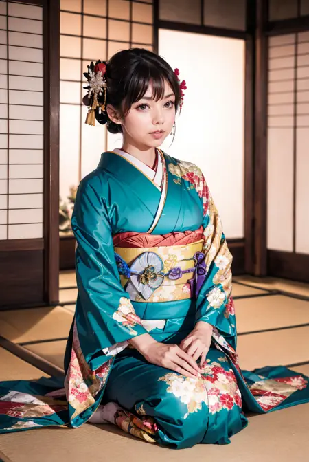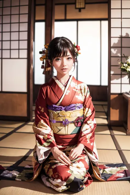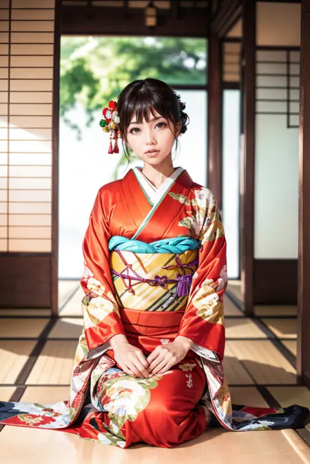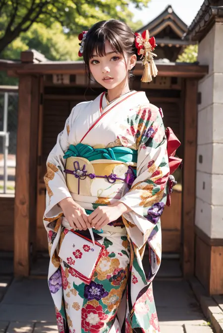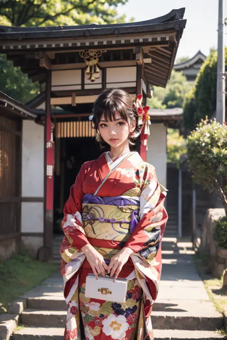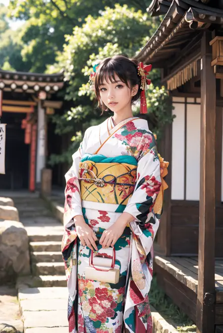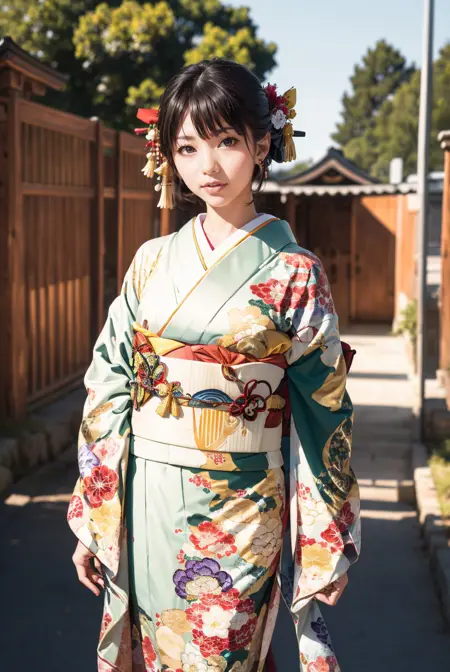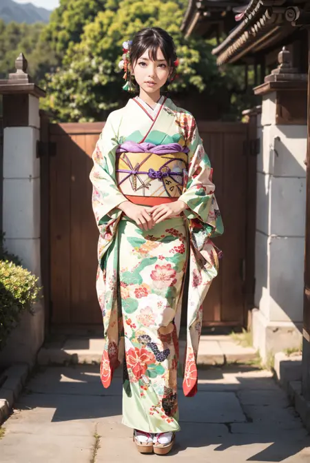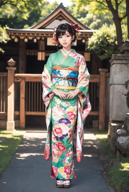 オプショントリガーワード:bag, black kimono, blue kimono, floral print, furisode, geta, green kimono, hair bow, kanzashi, kimono, obi, pink kimono, red kimono, sash, tabi, white kimono, yellow kimono