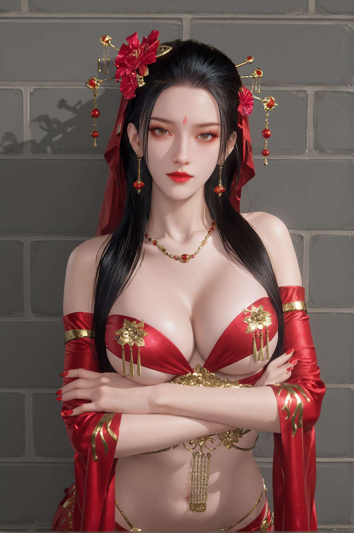 priestess_classic, 1girl, solo, black hair, long hair, hair ornament, hair flower, veil, red eyes, forehead mark, mole, earrings, makeup, large breasts, realistic, revealing clothes, detached sleeves