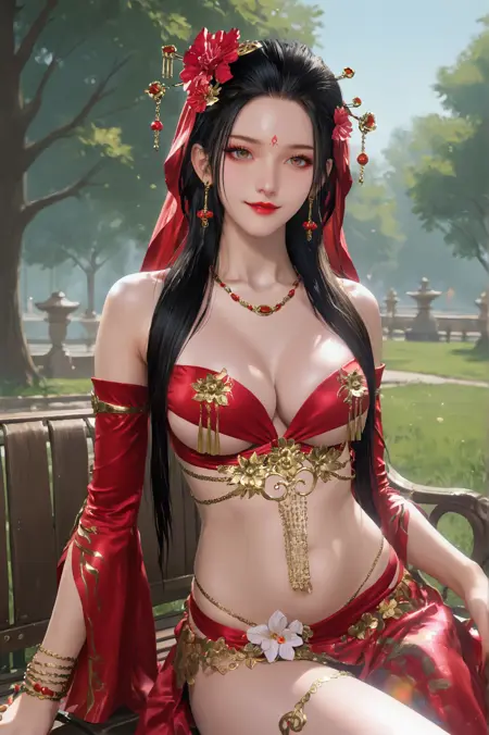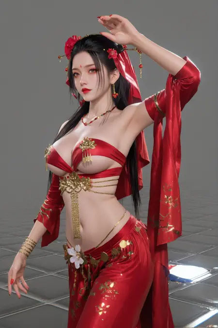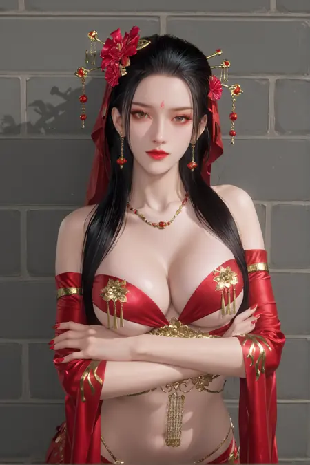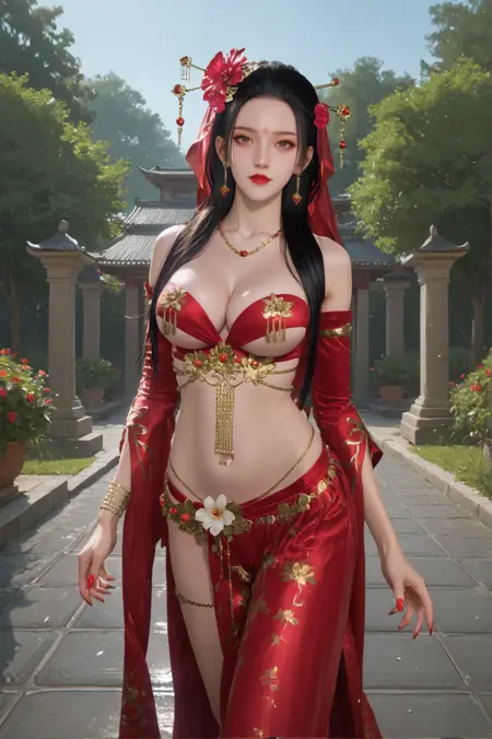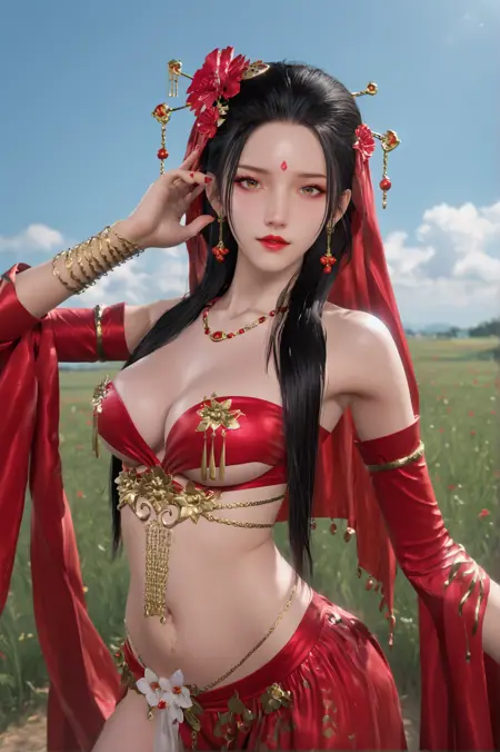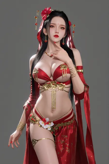 priestess_classic, 1girl, solo, black hair, long hair, hair ornament, hair flower, veil, red eyes, forehead mark, mole, earrings, makeup, large breasts, realistic, revealing clothes, detached sleeves