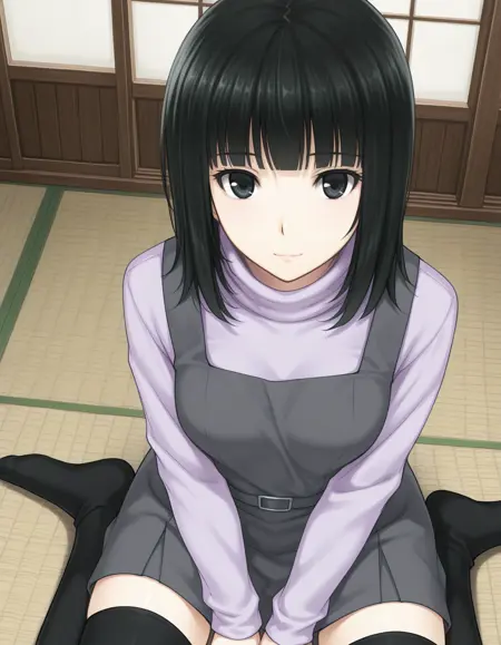 takamiya meguri, black hair, medium hair, blunt bangs, black eyes