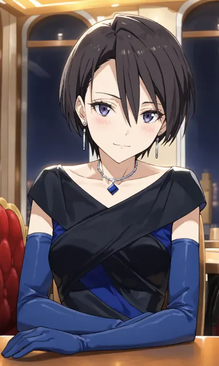 3. hinatadresstwo, 팔꿈치 장갑, 파란 장갑, 어깨뼈, 목걸이, 귀걸이, 다중 색상 드레스,