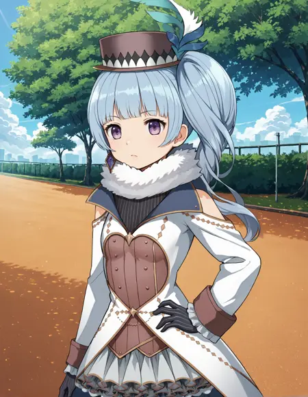 Magical outfit: mgrckumiseika, brown feathered hat, white fur scarf, single purple earring, black striped top, white coat, shoulder cutout, heart cutout, brown vest, white frilled skirt, black striped gloves, black striped pantyhose