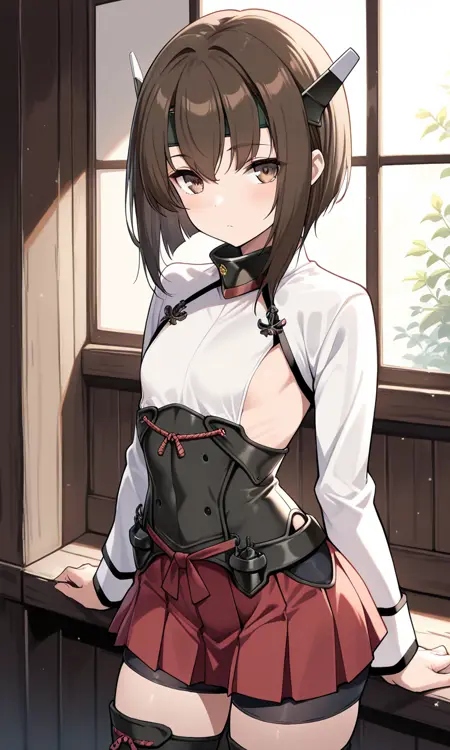 Default outfit : taihouKC,bob_cut,brown hair, brown eyes,pleated skirt,red skirt, bike shorts, black thighhighs, headband,headgear,hakama short skirt, shorts under skirt,corset ,long sleeves,flat chest,sidelocks, white sleeves,sideboob,