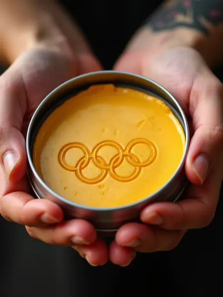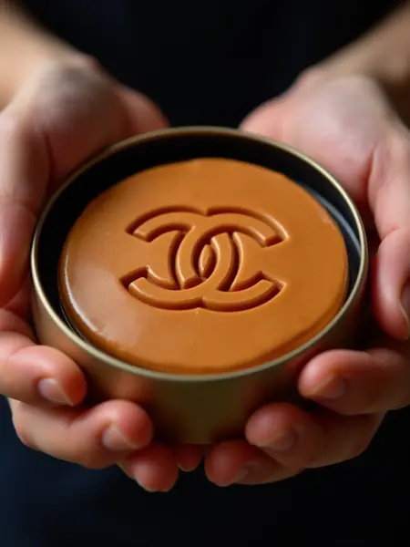 刻まれた**[この言葉]**の模様を持つ平らなダルゴナ飴が、両手で保持された円形の tin に置かれ、飴の平らな表面に鮮やかでクローズアップされた焦点が当たっており、精密な彫刻と抽出のために作られています。