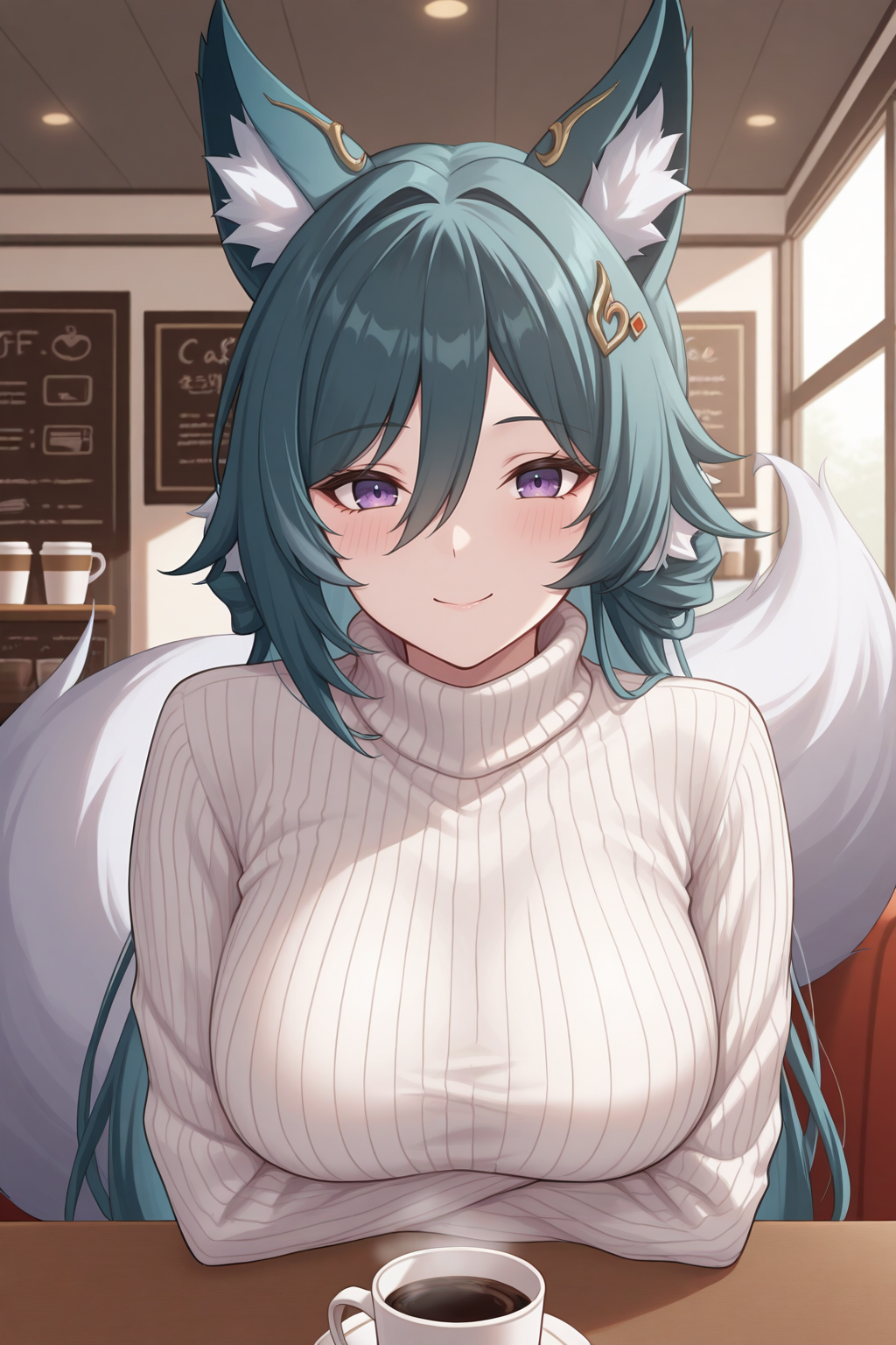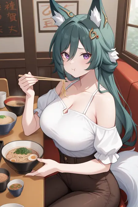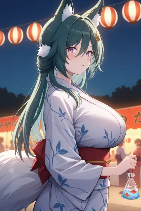 외모: ykng, 여우 귀, 여우 꼬리, 녹색 머리카락, 눈 사이의 머리카락, 보라색 눈, 큰 가슴, 머리 장식