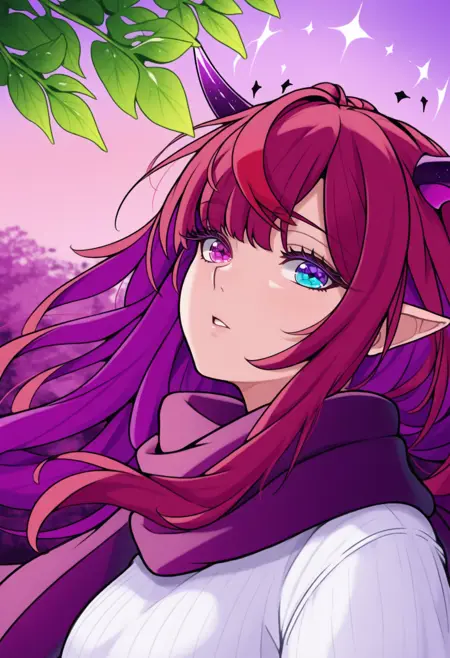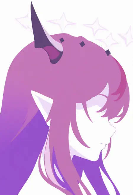 1RyS, heterochromia, purple eye, blue eye, horns, double halo, multicolored hair, purple hair, long hair
