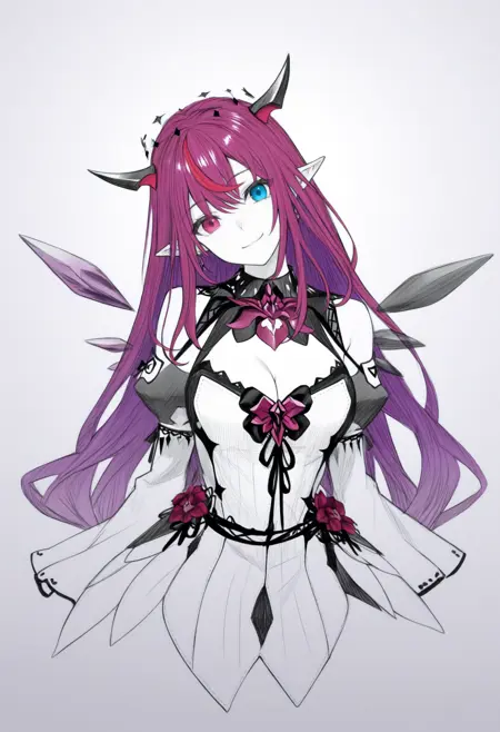 1RySCas, heterochromia, purple eye, blue eye, horns, multicolored hair, purple hair, short hair, white beret, hat bow, earrings, black choker, necklace, white dress, off-shoulder dress, black bow, black pantyhose