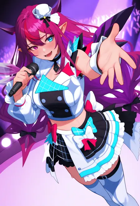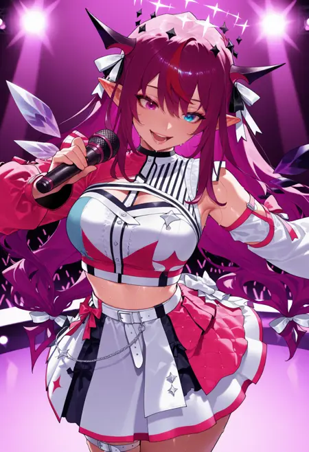 1RySIdl, heterochromia, purple eye, blue eye, horns, multicolored hair, purple hair, long hair, white mini hat, tilted headwear, double-breasted, crop top, idol uniform, uneven sleeves, single long sleeve, wrist cuffs, white skirt, half-skirt, frills, black shorts, thigh strap, single white thighhigh, crystal wings, detached wings