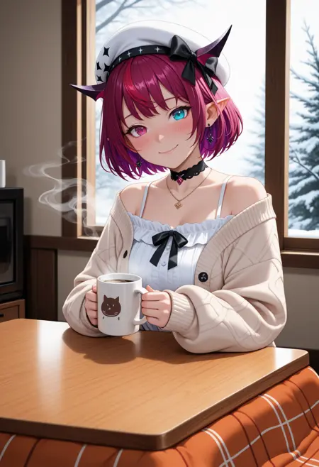 1RySCas, heterochromia, purple eye, blue eye, horns, multicolored hair, purple hair, short hair, white beret, hat bow, earrings, black choker, necklace, white dress, off-shoulder dress, beige cardigan, black bow, black pantyhose
