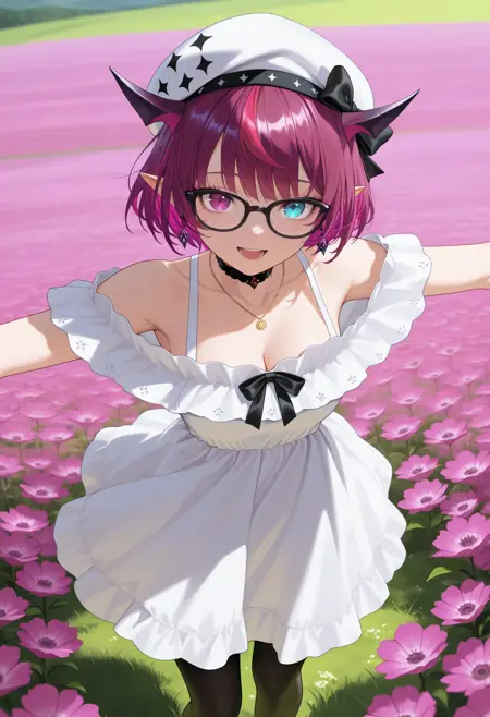 1RySCas, heterochromia, purple eye, blue eye, horns, multicolored hair, purple hair, short hair, white beret, hat bow, earrings, black choker, necklace, white dress, off-shoulder dress, sleeveless, black bow, black pantyhose