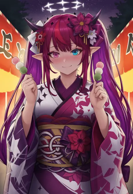 1RySNwYrs, heterochromia, purple eye, blue eye, horns, double halo, multicolored hair, purple hair, long hair, twintails, hair flower, multicolored kimono, purple kimono, white kimono, print kimono, wide sleeves, obi