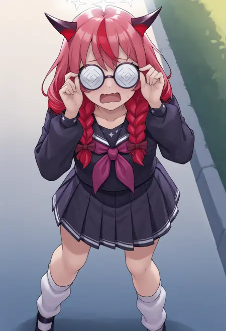 1RySGam, heterochromia, purple eye, blue eye, horns, double halo, multicolored hair, purple hair, short hair, hair over shoulders, twin braids, black serafuku, long sleeves, purple neckerchief, black skirt, white socks
