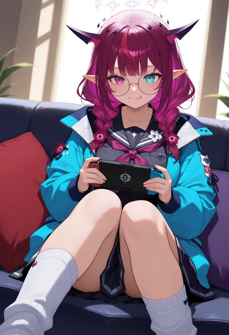 1RySGam, heterochromia, purple eye, blue eye, horns, double halo, multicolored hair, purple hair, long hair, twin braids, hair flower, black serafuku, blue jacket, purple neckerchief, black skirt, white socks