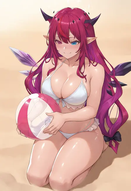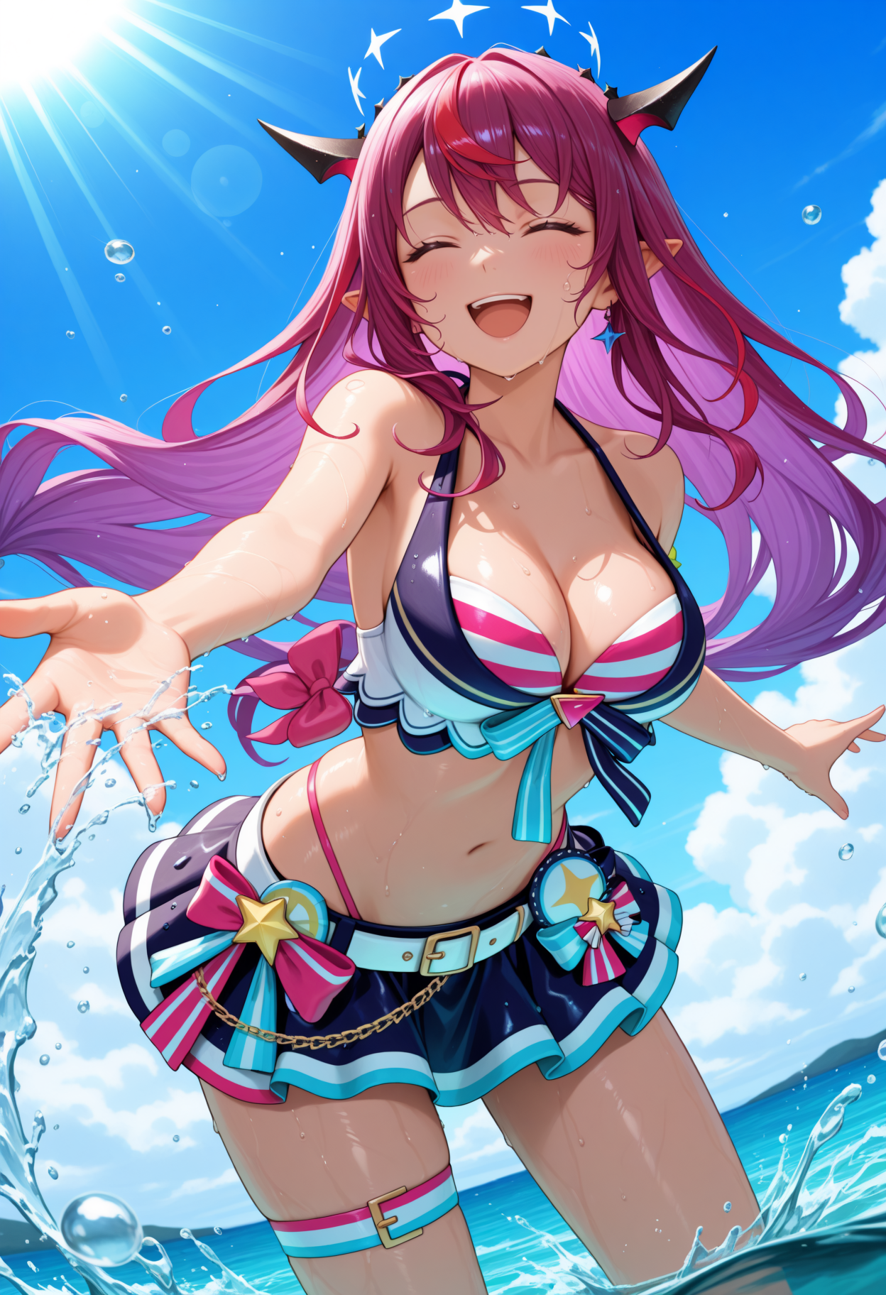 1RySSmmer, heterochromia, purple eye, blue eye, horns, double halo, multicolored hair, purple hair, long hair, layered bikini, striped bikini, pink bikini, white bikini, front-tie bikini top, highleg, white belt, blue bikini skirt, pink waist bow, thigh strap