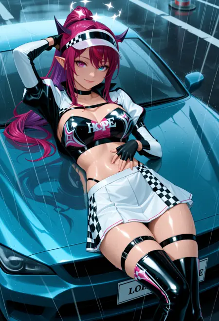 1RySRceQuee, heterochromia, purple eye, blue eye, horns, double halo, multicolored hair, purple hair, long hair, high ponytail, visor cap, black choker, race queen, white shrug \(clothing\), long sleeves, fingerless gloves, black gloves, breast strap, tube top, crop top, midriff, clothes writing, panty straps, white skirt, thigh strap, thigh boots