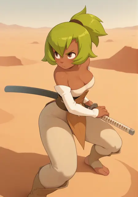 S3/4: ponytail, detached sleeves, strapless, pants,