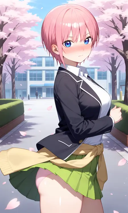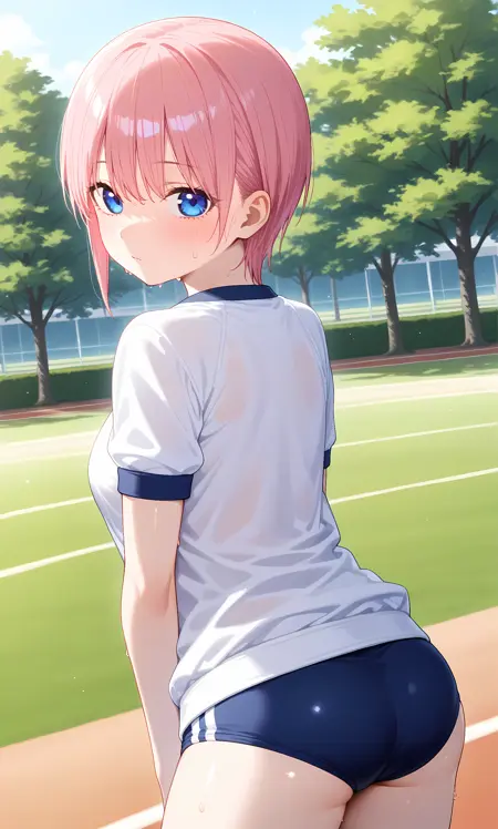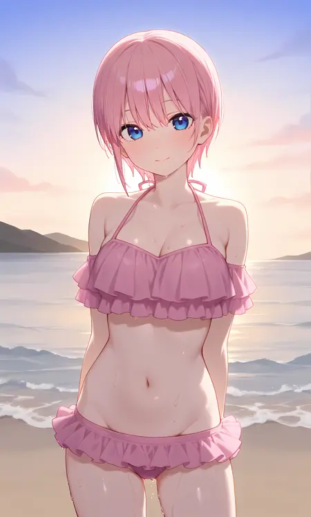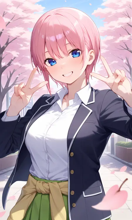 nakano ichika, short_hair, pink_hair, hair_between_eyes, blue_eyes