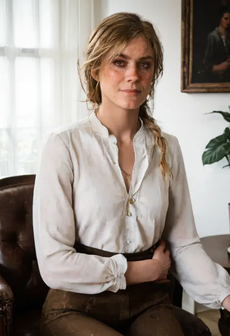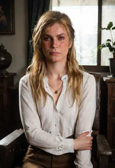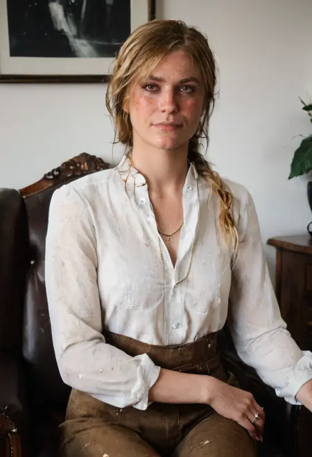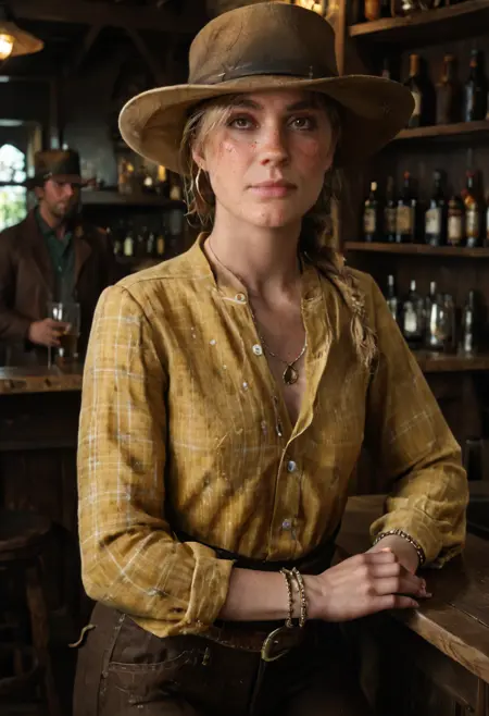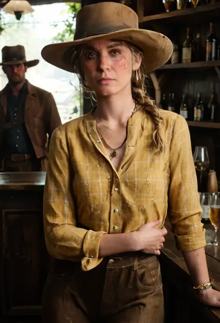 使用:"blonde,single braid,long braid,brown eyes,freckles,sadie_adler,yellow plaid shirt brown pants,sadie adler" + 该Lora。