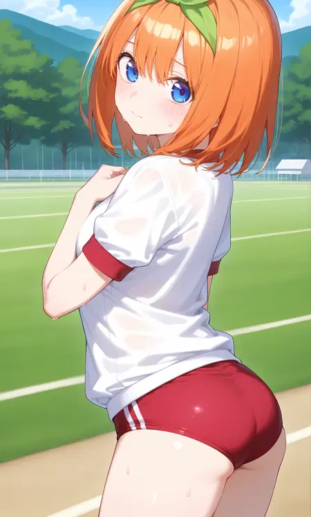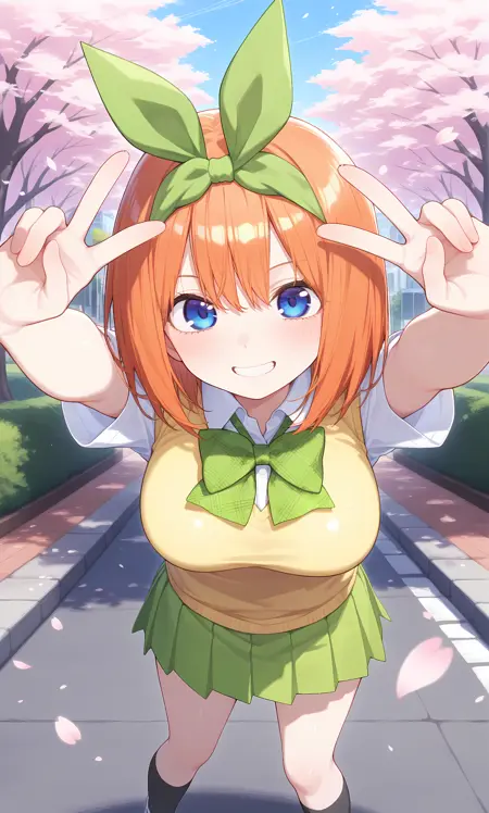 中野五叶,橙色头发,绿色丝带,发带,头发位于眼睛之间,蓝色眼睛,中长发