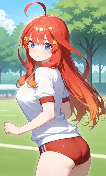 nakano itsuki、長い髪、赤髪、髪飾り、星型の髪飾り、額の髪、青い目、ahoge、star_(symbol)