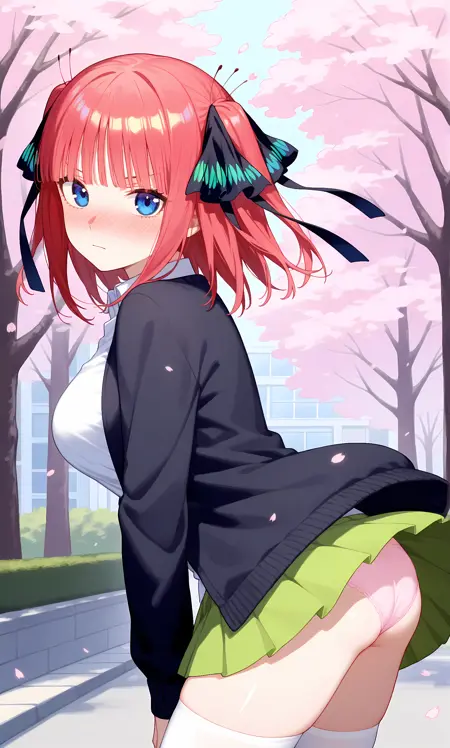 nino nakano, pink hair, blunt bangs, hair ornament, butterfly hair ornament, black ribbon, hair ribbon, blue eyes, two side up, short hair, red hair