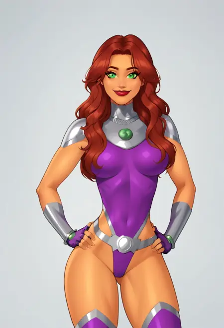 | 训练词汇 | 2d, solo, Starfire, 1girl, alien female, colored skin, orange skin, orange-skinned female, orange skin tone, orange skin, green eyes, red hair, long hair, leotard, purple leotard, vambraces, thigh highs, fingerless gloves, green gems, silver armor, red lips已复制! |