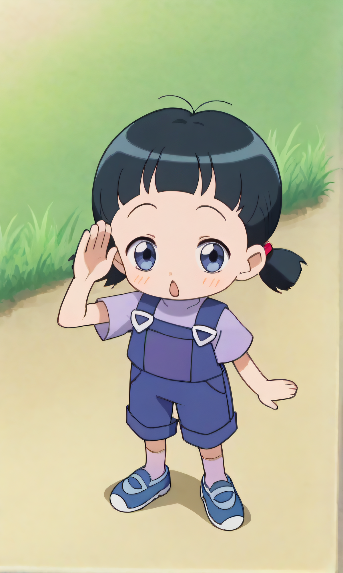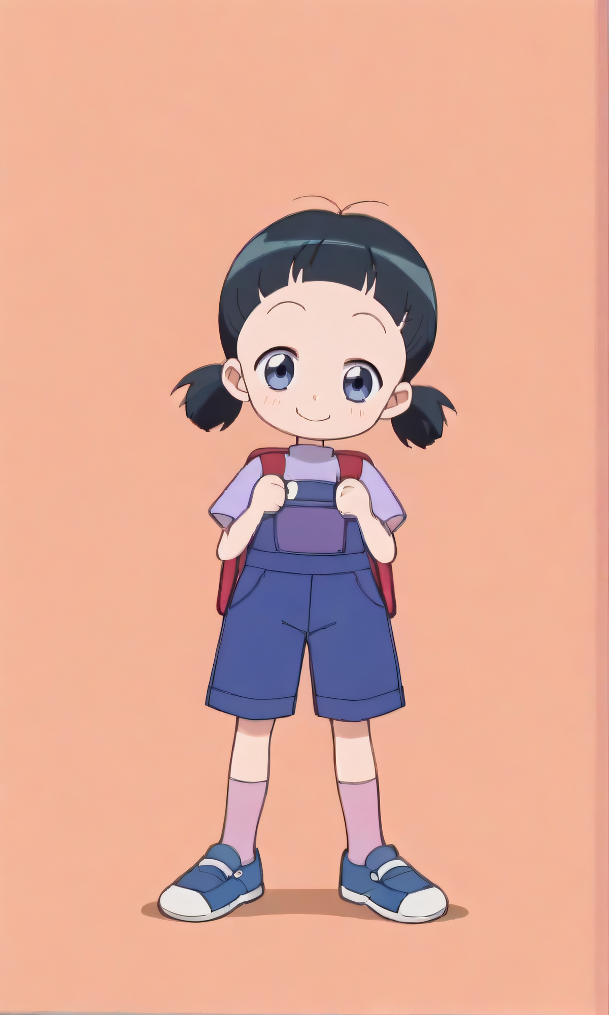 kumiko, child, black hair, blue eyes, twintails, purple shirt, overalls, purple socks, blue shoes