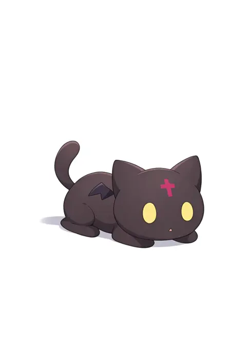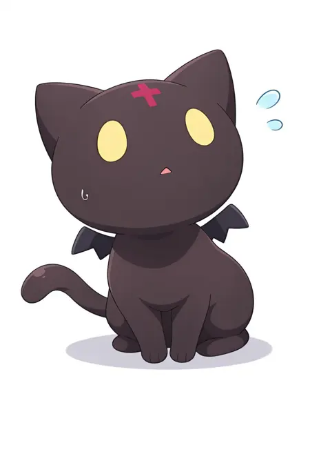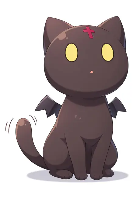 Chomusuke-Liver020, solo, cat, small tail, Chomusuke-Liver020, brown cat, yellow eyes, brown cat, black cat, no human, red cross, animal, animal focus, cat focus, bat wings, small tail, :3, : 3