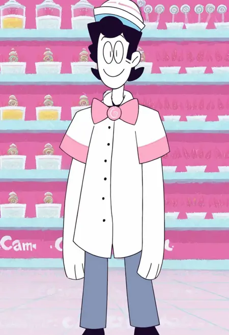 white shirt, buttons, single pink line on both sleeves, short sleeves, pink bowtie, white employee cap, light blue pants, black shoes