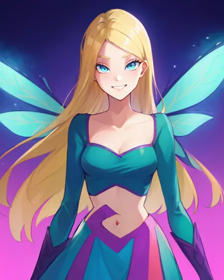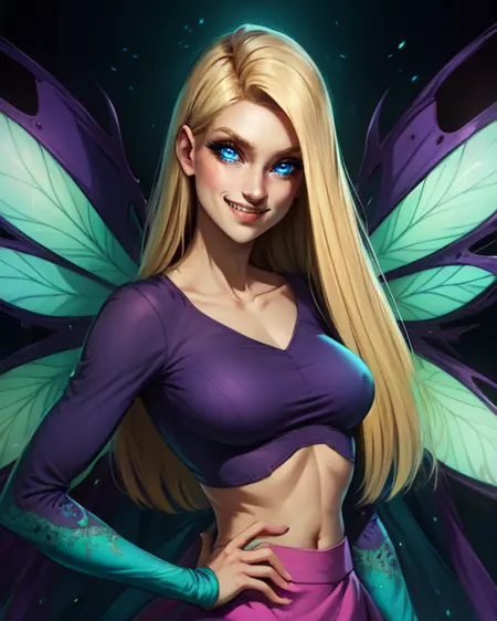 줄무늬 팬티스타킹, 긴 보라색 치마, 요정 날개 또는 날개, 보라색 부츠, 클라비클, 긴 소매, 티올 커프탑