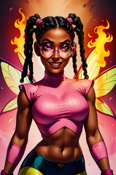 striped pantyhose, midriff, pink wristbands, fairy wings, pink crop top, turtleneck,