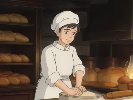 A scene from a Studio Ghibli animated film, featuring [CHARACTER DESCRIPTION], as they [ACTION] at [ENVIRONMENT], under [LIGHTING], with [ADDITIONAL SETTING DETAILS], while the camera [CAMERA WORK], emphasizing [MOOD AND AMBIANCE].