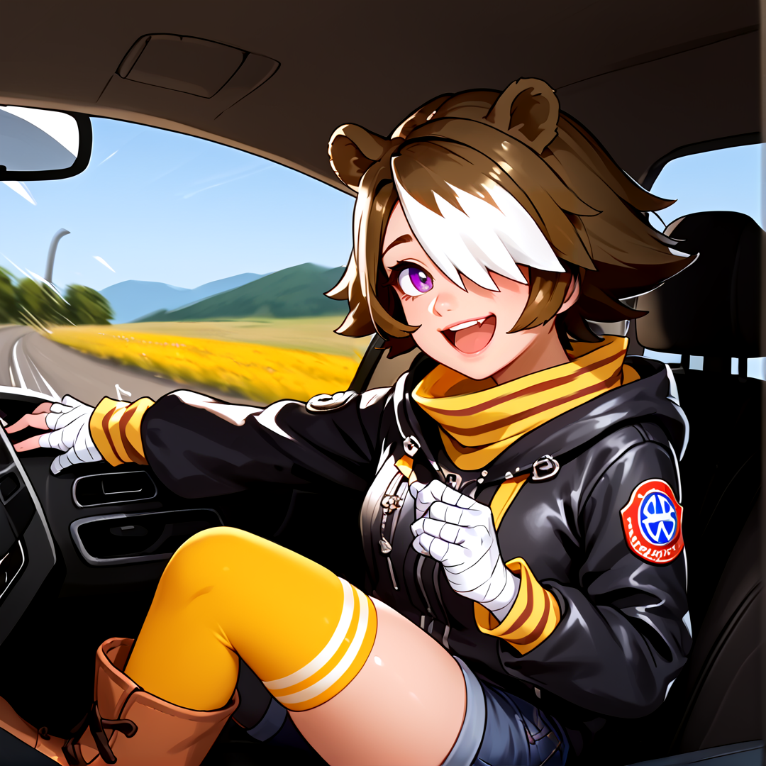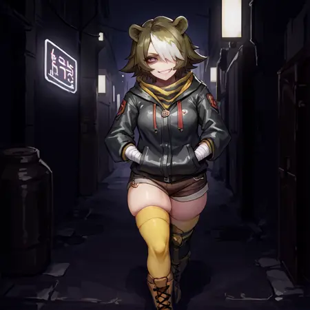 Outfit trigger : black jacket, short shorts, boots, yellow single thighigh, long sleeves, bandaged hand, striped