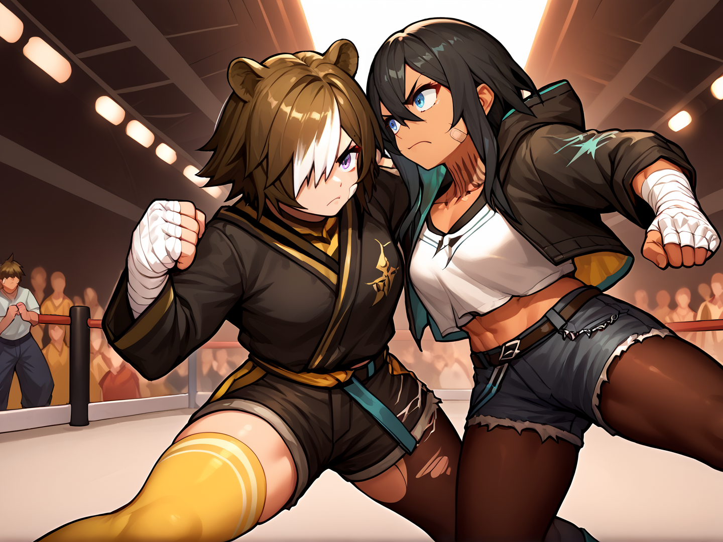 Base trigger : akbeehunter, bear ears, brown hair, white hair, purple eyes, short hair, multicolored hair, hair over one eye