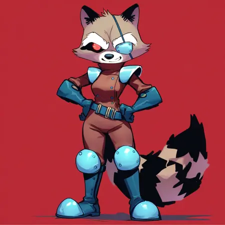 Raccoon, black and brown fur, red eyes, white muzzle, white eyebrows, black nose, metal eyepatch